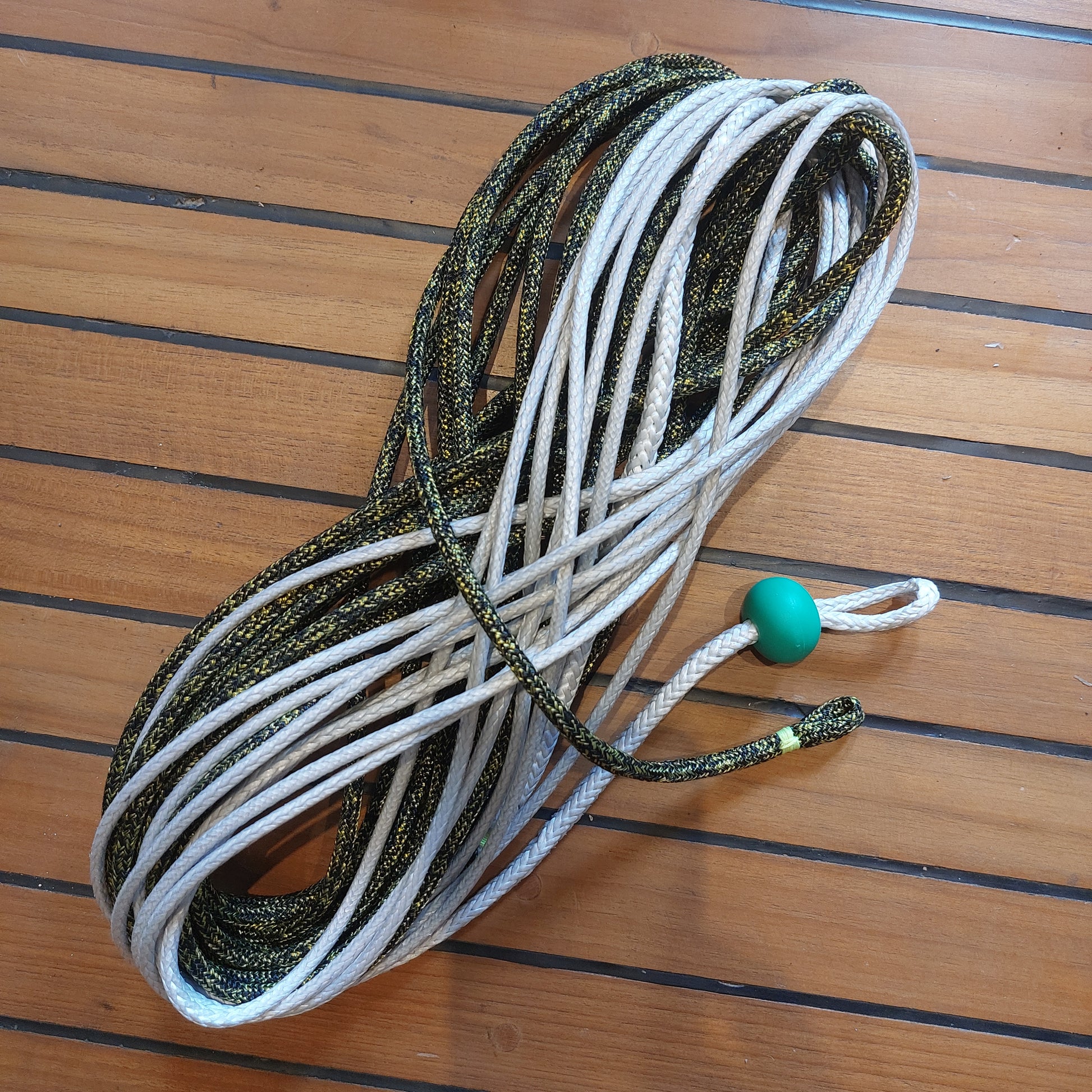 This Etchells spinnaker halyard is 6mm Premium Ropes S Cup line. It runs well, is very low stretch and is light weight. One end of the halyard is finished with either an eye splice or left without a splice for tying directly on to the spinnaker, the other end is finished with a Flemish / Reeving Eye. The halyard can be used with a soft shackle or a regular shackle. The cover has been stripped to 7m for less friction in the hoists.