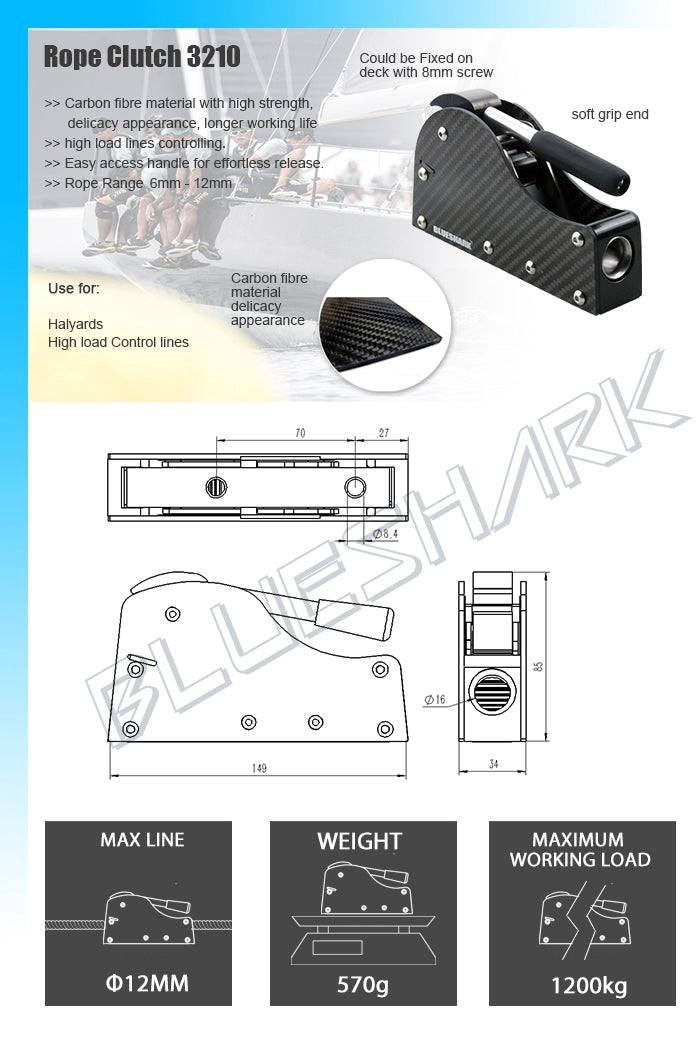 Carbon fibre rope clutch for high load lines. effortless release with a. soft grip handle.